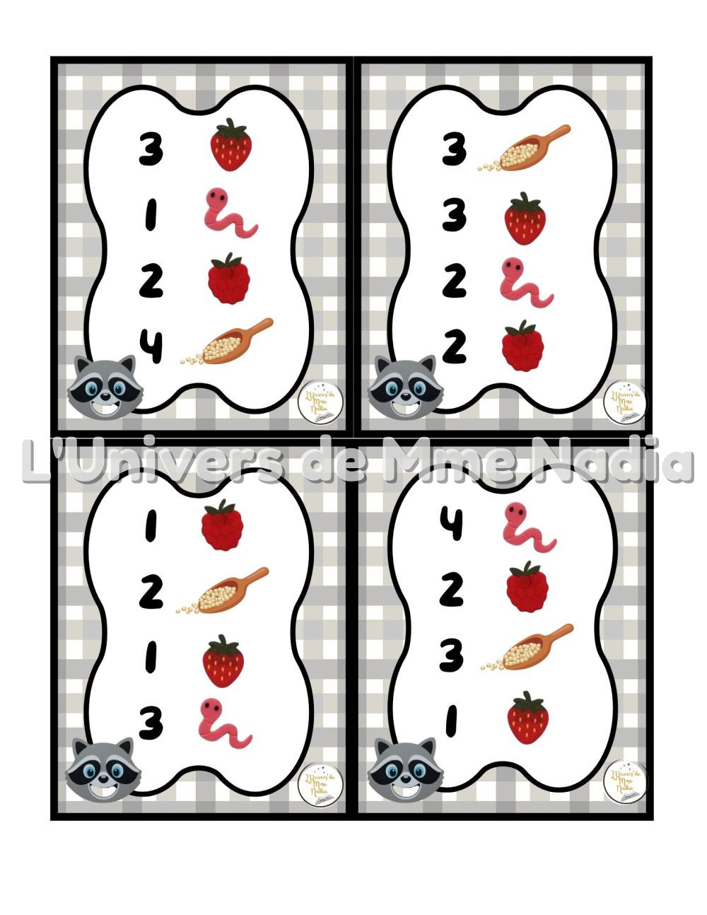 Le raton laveur a faim est un jeu complémentaire au plateau J'ai faim, créé par Ébénisterie Steve Genesse. Le jeu comprend 32 petits menus conçus pour nourrir le raton laveur de façon ludique et éducative. Chaque carte propose un menu à réaliser avec différents éléments : • des framboises et des fraises • des vers de terre et la possibilité d'ajouter des cuillères de mélange sensoriel. Les enfants sont invités à : • choisir le bon ingrédient, • mettre la bonne quantité, • et suivre les consignes du menu. Ce jeu permet de travailler les quantités, l'association, l'attention et la motricité fine, tout en ajoutant une dimension sensorielle et amusante. Avec ses 32 cartes toutes différentes, Le raton laveur a faim offre une belle variété de défis pour enrichir l'utilisation du plateau J'ai faim.