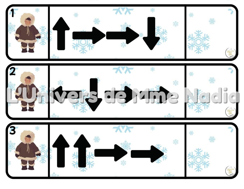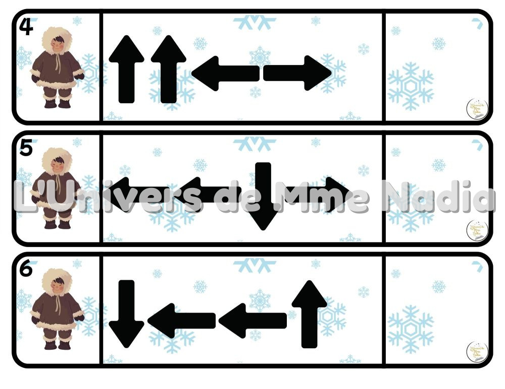 Chaque fiche propose un parcours différent, composé de trois, quatre, cinq flèches ou plus. En suivant ces indications, l'enfant apprend à se repérer dans l'espace, à analyser un trajet et à anticiper un déplacement. Une fois le parcours terminé, il doit identifier l'image d'arrivée et la placer au bout de la fiche correspondante.