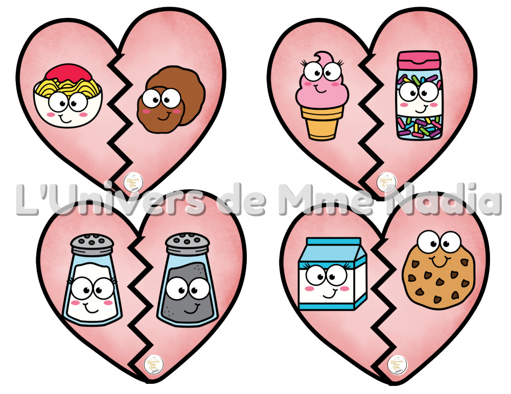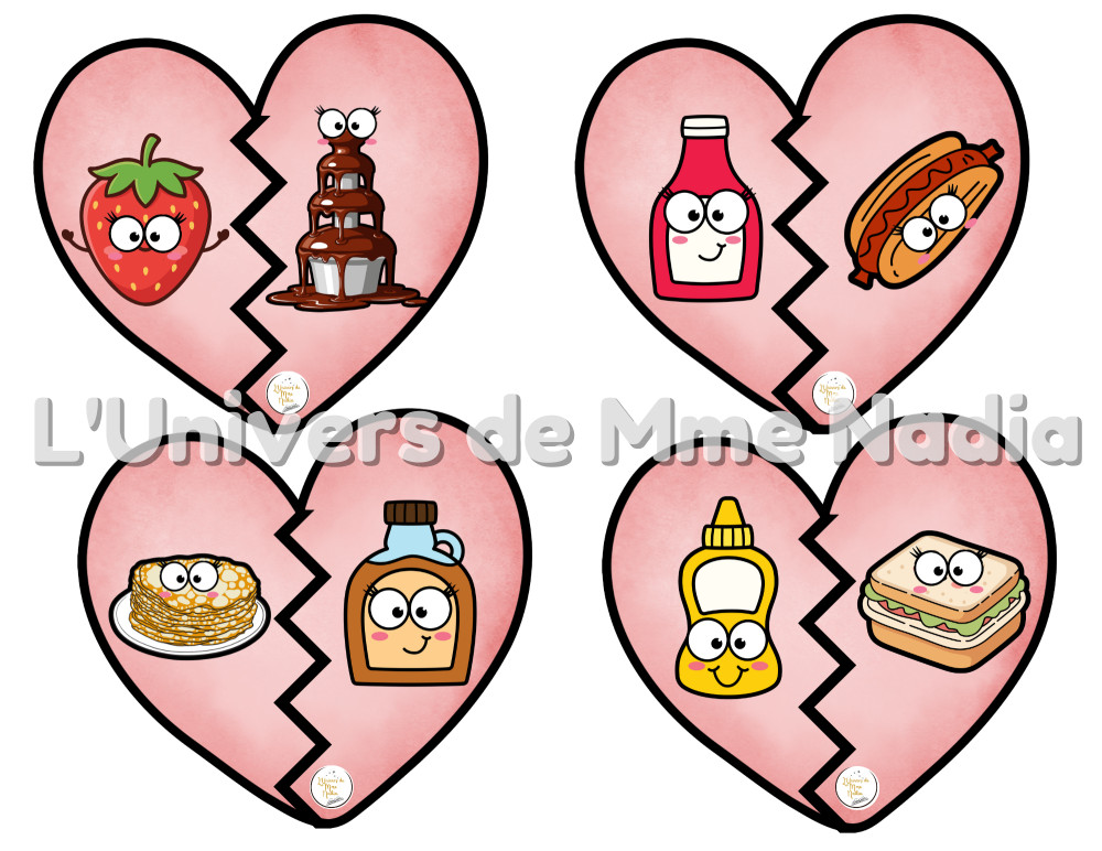 Dans ce jeu, les aliments sont en amour… mais ils ont été séparés ! Tu trouveras 56 aliments qui forment 28 paires spéciales. Chaque paire est composée de deux aliments qui vont bien ensemble, comme la fraise et le chocolat, l'œuf et le bacon, ou encore le sel et le poivre. Ton défi : observer les images et retrouver quel aliment va avec quel autre aliment. Quand tu trouves les bonnes paires, tu réunis les aliments amoureux ! Amusez-vous à former les couples d'aliments et découvrez toutes les délicieuses associations !