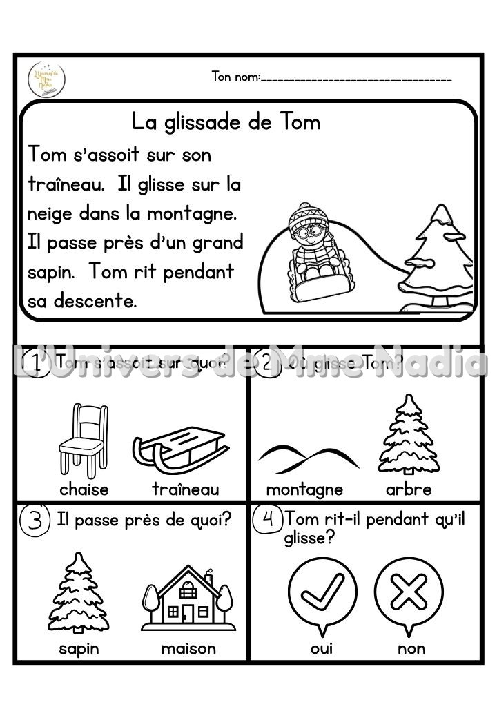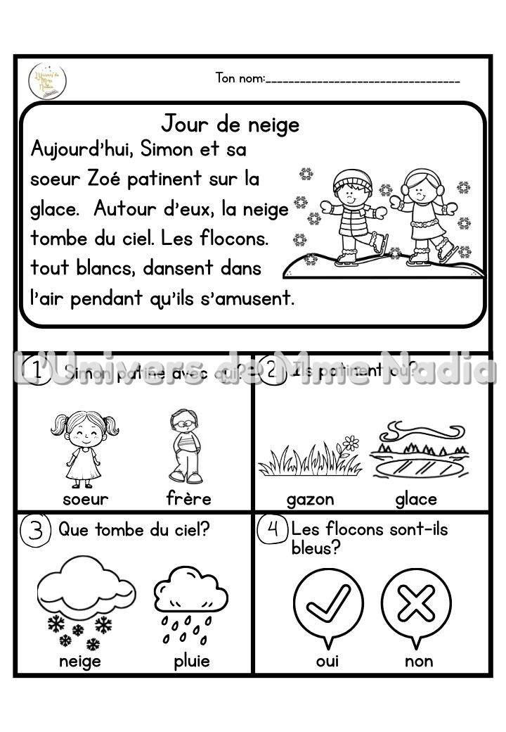 Le voici, le voilà !!!! Je suis très heureuse de vous présenter la version « Hiver ». Ce document comprend 10 petites histoires sur le thème de l'hiver. Chaque histoire est accompagnée de 4 questions de compréhension.