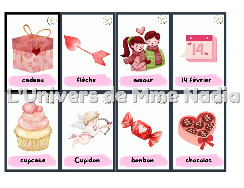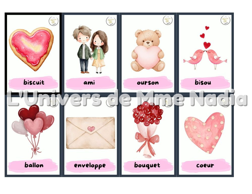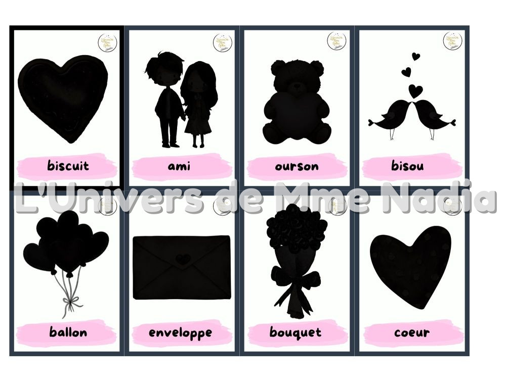 Ce document comprend 36 mots étiquettes sur le thème de la Saint-Valentin, présentés en double exemplaire : la version standard et la version en ombre, pour un total de 72 cartes. Ces cartes sont parfaites pour :