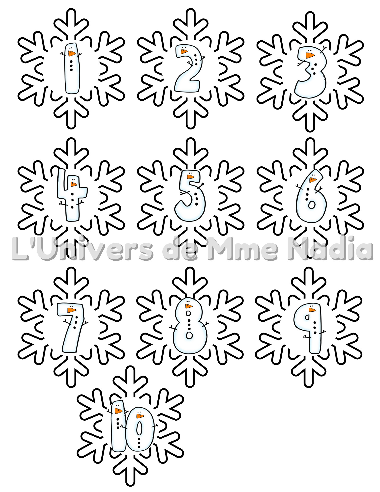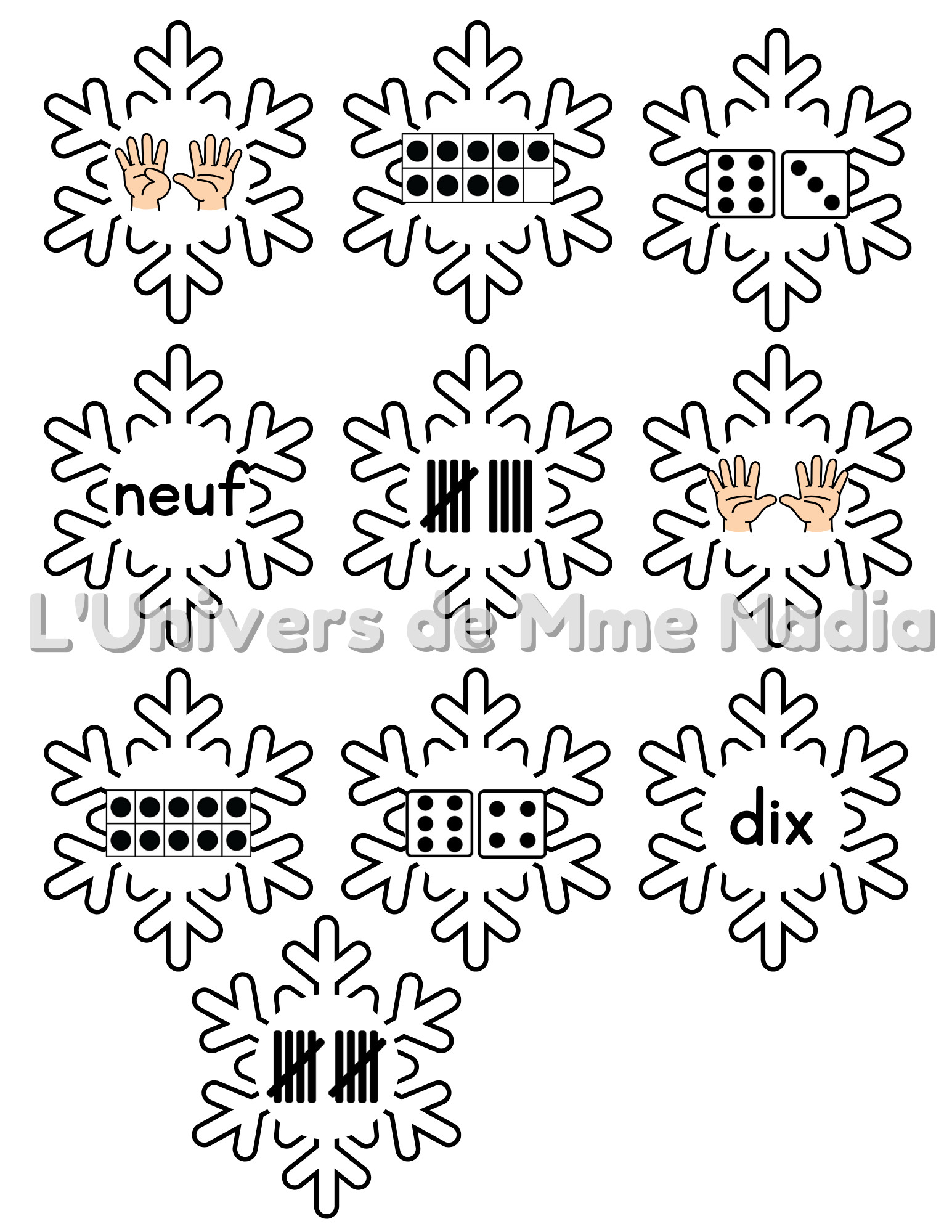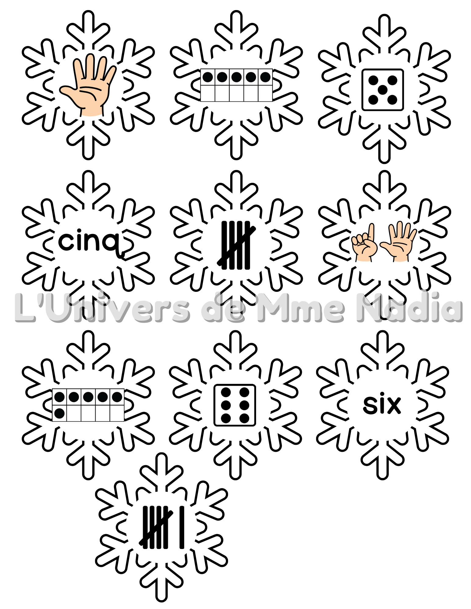 Bonhomme a faim de nombres est un document ludique et concret qui permet de travailler les nombres de 1 à 10, leurs différentes représentations ainsi que la valeur du nombre. Le principe est simple et motivant : on pige un nombre de 1 à 10, puis l’enfant doit repérer tous les flocons qui correspondent à ce nombre et les faire « avaler » au bonhomme de neige à l’aide de sa bouche trouée. Chaque nombre est présenté de sept façons différentes, ce qui amène l’enfant à comparer, associer et comprendre que toutes ces représentations correspondent à une même valeur :
