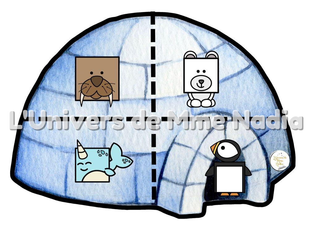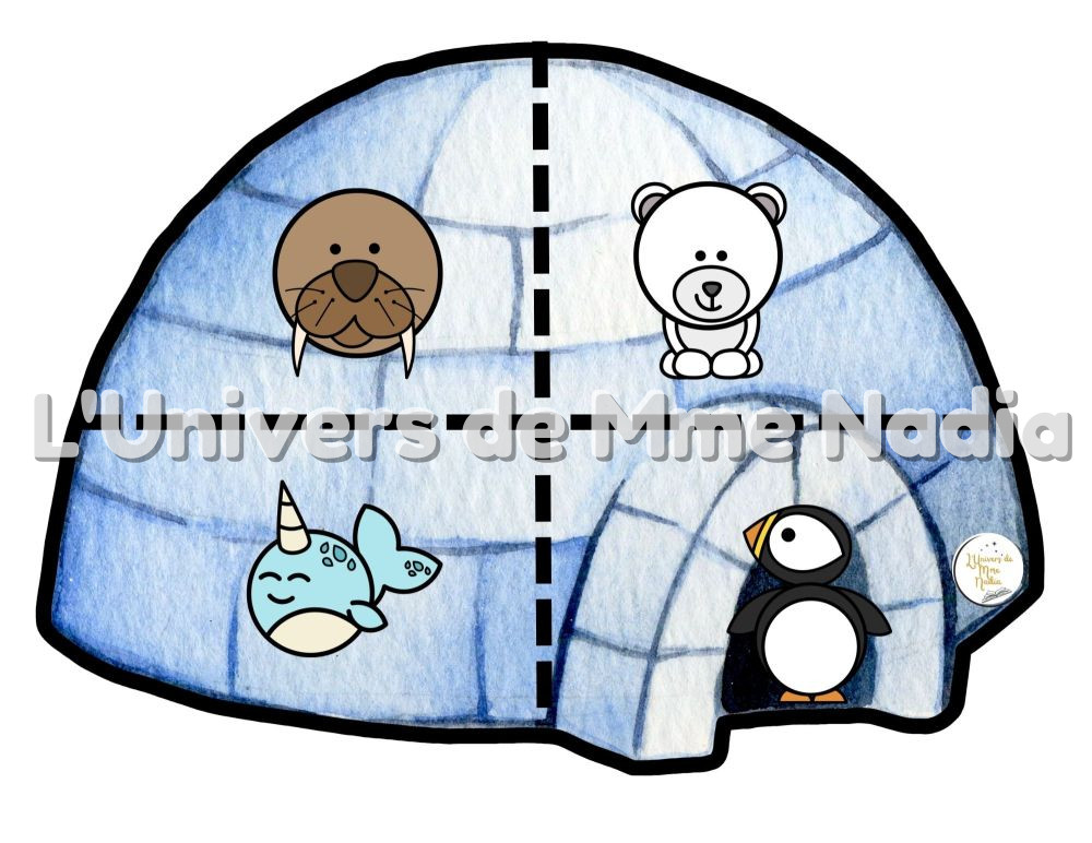 L’igloo des formes est une activité ludique et éducative qui aide les enfants à reconnaître et à associer différentes formes tout en s’amusant. L’igloo est divisé en quatre parties, à assembler comme un casse-tête . Chaque partie présente un animal du monde polaire dont la tête ou le corps a la même forme. On y retrouve un morse , un ours polaire , un narval et un pingouin , chacun associé à une forme particulière. Les formes travaillées sont : carré , cercle , triangle , rectangle , losange , ovale , étoile et cœur . Cette activité favorise l’observation , la discrimination visuelle et le plaisir d’apprendre par le jeu .