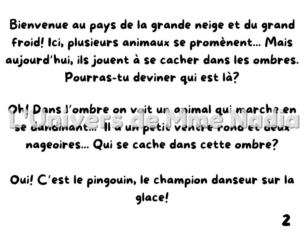 « Qui se cache au pays de la neige et du froid? » est un kamishibaï interactif qui invite les enfants à explorer un univers blanc et glacé, rempli de mystère. Dans ce pays de la grande neige, les animaux aiment jouer à cache-cache… mais aujourd’hui, on ne voit d’eux que leurs ombres ! À travers de courtes devinettes, les enfants observent, réfléchissent et devinent quel animal se cache dans l’ombre. À chaque découverte, l’animal apparaît enfin en couleur, pour le plus grand plaisir des petits spectateurs. Les enfants sont invités à participer activement : chacun peut tenir un animal dans ses mains et le montrer au bon moment, lorsque son ombre est révélée. Une histoire ludique et sensorielle qui stimule l’observation, l’imagination et la participation, tout en faisant découvrir les animaux du froid.