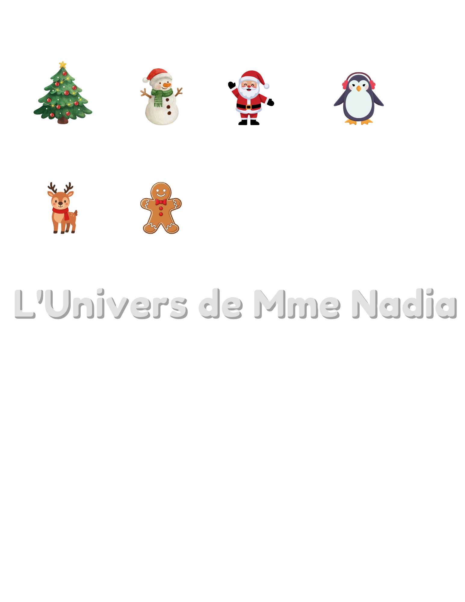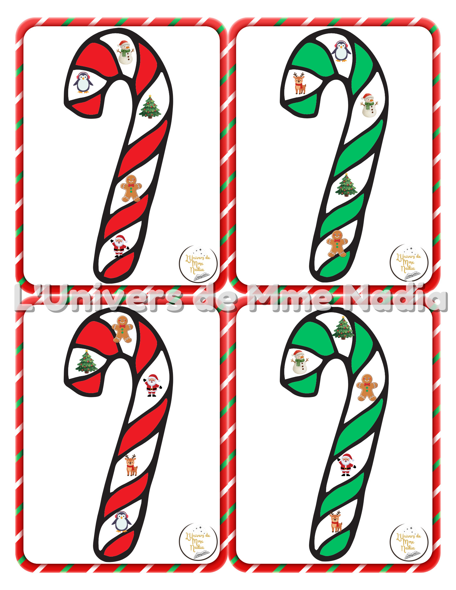 Cachettes dans les cannes en bonbon est une activité ludique parfaite pour développer l’observation, la logique et la reproduction de modèles ! Le jeu propose 20 modèles à reproduire, réalisés à partir de petites effaces du Dollarama représentant différents personnages festifs : un Père Noël, un sapin, un renne, un pingouin, un bonhomme en pain d’épices et un mini Père Noël. Les planches de jeu sont des cannes à bonbons : • 10 modèles avec des cannes rouges et blanches, • 10 modèles avec des cannes vertes et blanches. Chaque canne alterne blanc – couleur – blanc – couleur – blanc. Le défi : placer la bonne figurine dans chaque espace blanc, en reproduisant exactement ce qui apparaît sur la fiche-modèle. Et pas d’inquiétude si vous n’avez pas les petites figurines ! Les images des personnages sont fournies à la fin du document, prêtes à être imprimées et découpées. Les enfants peuvent donc jouer en version papier ou avec les vraies effaces, selon ce que vous avez sous la main. Une activité simple, engageante et idéale pour plonger dans la magie des Fêtes !