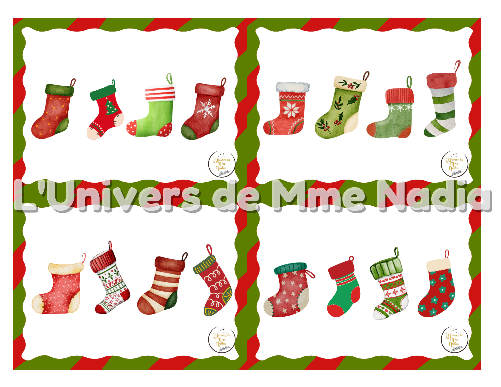 Préparez-vous à mettre vos bas de Noël… au bon endroit ! Comment jouer ? Chaque joueur a devant lui une planche de jeu représentant un foyer avec une tête de foyer. Il y a 4 bas à placer à chaque tour. Les enfants doivent choisir le bon bas et les placer dans le bon ordre sur la tête de foyer, en suivant les modèles proposés. Il y a 20 modèles différents à reproduire et 16 bas différents pour pimenter le jeu ! Un jeu parfait pour travailler la logique, la mémoire et la concentration, tout en s’amusant à la manière des fêtes de Noël !